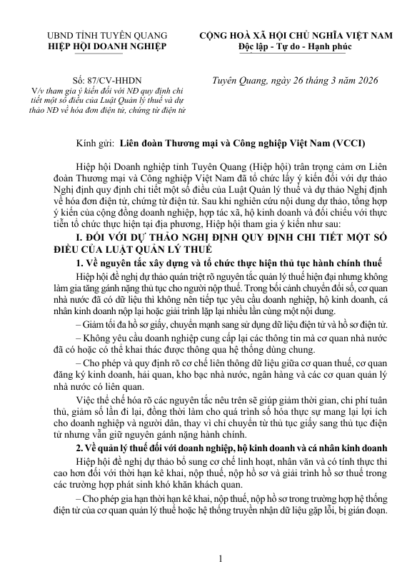 Tạp chí điện tử Doanh nghiệp và hội nhập - Cơ quan ngôn luận của Trung ương Hiệp hội Doanh nghiệp nhỏ và vừa Việt Nam vừa đăng tải bài viết “Chính sách thuế 2026: Góc nhìn từ cộng đồng doanh nghiệp về giảm gánh nặng và tăng tính thực thi” của tác giả Hạnh Nguyên, trên cơ sở kiến nghị của Hiệp hội Doanh nghiệp tỉnh Tuyên Quang gửi đến Liên đoàn Thương mại và Công nghiệp Việt Nam (VCCI). Trang Thông tin điện tử của Hiệp hội trân trọng giới thiệu bài viết này.