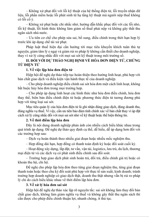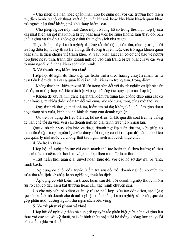 Một trong những vấn đề được đặt ra là nguy cơ “điện tử hóa thủ tục hành chính”. Khi các cơ quan quản lý đã có dữ liệu hoặc có khả năng khai thác từ hệ thống liên thông, việc tiếp tục yêu cầu doanh nghiệp kê khai, cung cấp lại thông tin hoặc giải trình lặp lại nhiều lần không chỉ làm gia tăng chi phí tuân thủ, mà còn làm giảm ý nghĩa của chuyển đổi số. Theo Hiệp hội, cải cách thuế trong giai đoạn này cần đi vào thực chất, trong đó nguyên tắc quan trọng là không yêu cầu người nộp thuế cung cấp lại những dữ liệu mà cơ quan nhà nước đã có.
