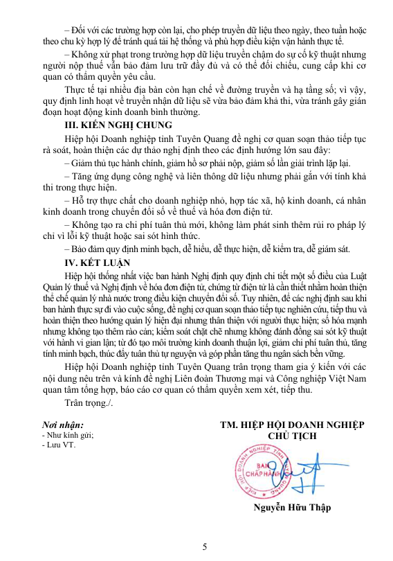 Từ góc nhìn tổng thể, các kiến nghị của Hiệp hội Doanh nghiệp tỉnh Tuyên Quang cho thấy một yêu cầu nhất quán: chính sách thuế cần được thiết kế theo hướng hiện đại nhưng thân thiện, số hóa nhưng không làm gia tăng gánh nặng, kiểm soát chặt chẽ nhưng phải phân biệt rõ giữa vi phạm và sai sót kỹ thuật.