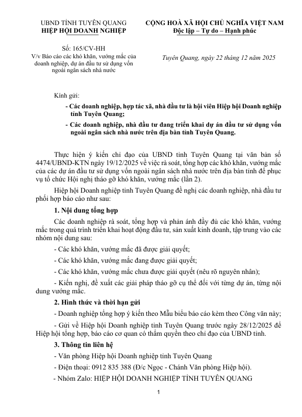 Thực hiện ý kiến chỉ đạo của UBND tỉnh Tuyên Quang tại văn bản số 4474/UBND-KTN ngày 19/12/2025 về việc rà soát, tổng hợp các khó khăn, vướng mắc của các dự án đầu tư sử dụng vốn ngoài ngân sách nhà nước trên địa bàn tỉnh để phục vụ tổ chức Hội nghị tháo gỡ khó khăn, vướng mắc (lần 2); ngày 22/12/2025, Hiệp hội Doanh nghiệp tỉnh Tuyên Quang có văn bản số 165/CV-HH về việc báo cáo khó khăn, vướng mắc của doanh nghiệp, dự án đầu tư sử dụng vốn ngoài ngân sách Nhà nước.