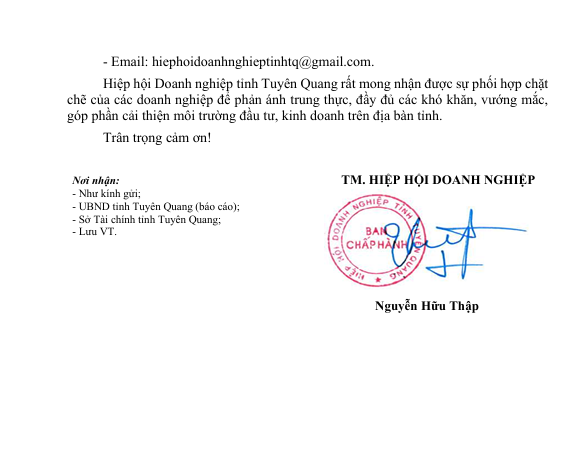 Hiệp hội Doanh nghiệp tỉnh Tuyên Quang rất mong nhận được sự phối hợp chặt chẽ của các doanh nghiệp để phản ánh trung thực, đầy đủ các khó khăn, vướng mắc, góp phần cải thiện môi trường đầu tư, kinh doanh trên địa bàn tỉnh./.