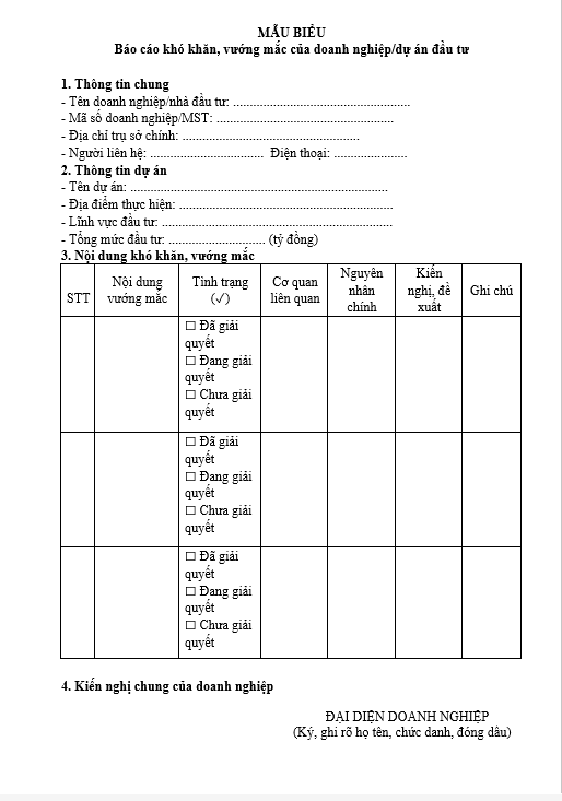 Theo đó, các doanh nghiệp, hợp tác xã, nhà đầu tư là hội viên Hiệp hội Doanh nghiệp tỉnh Tuyên Quang; các doanh nghiệp, nhà đầu tư đang triển khai dự án đầu tư sử dụng vốn ngoài ngân sách nhà nước trên địa bàn tỉnh, tiến hành rà soát, tổng hợp và phản ánh đầy đủ các khó khăn, vướng mắc trong quá trình triển khai hoạt động đầu tư, sản xuất kinh doanh, tập trung vào các nhóm nội dung: