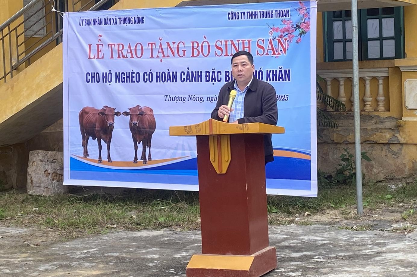Thay mặt lãnh đạo và Nhân dân xã Thượng Nông, đồng chí Nguyễn Văn Cướng, Phó Chủ tịch UBND xã trân trọng cảm ơn Doanh nhân Đỗ Trung Thoan và Công ty TNHH Trung Thoan đã luôn quan tâm, chia sẻ, đồng hành cùng địa phương trong công tác an sinh xã hội. UBND xã cũng giao nhiệm vụ cho các hộ gia đình được hỗ trợ tích cực chăm sóc, quản lý, phòng chống dịch bệnh cho bò; giao các tổ chức đoàn thể và trưởng thôn hướng dẫn kỹ thuật chăn nuôi, biện pháp dự trữ thức ăn, phòng chống rét, bảo đảm đàn bò sinh trưởng, phát triển hiệu quả.