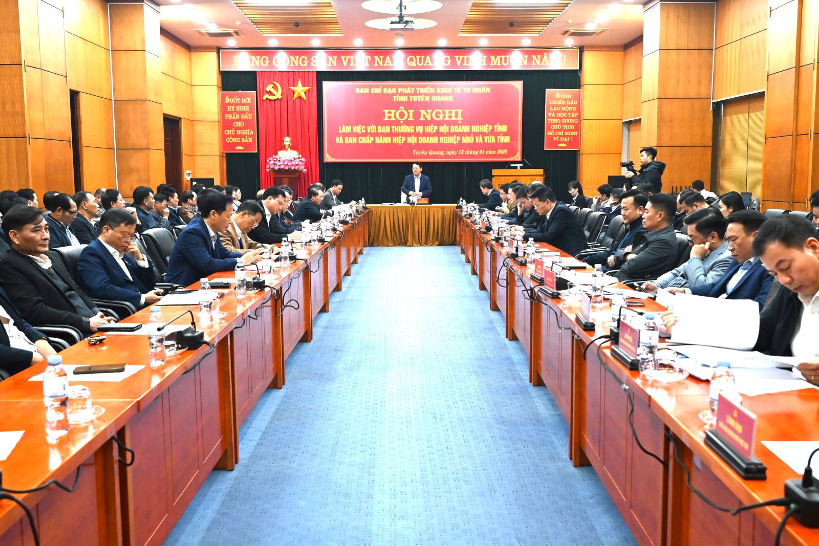Chiều ngày 15/01/2026, tại Trung tâm hội nghị tỉnh, Ban Chỉ đạo phát triển kinh tế tư nhân tỉnh Tuyên Quang tổ chức hội nghị làm việc với Ban Thường vụ Hiệp hội Doanh nghiệp tỉnh và Ban Chấp hành Hiệp hội Doanh nghiệp nhỏ và vừa tỉnh, thể hiện rõ sự quan tâm sâu sắc, trách nhiệm và tinh thần đồng hành của tỉnh đối với cộng đồng doanh nghiệp.