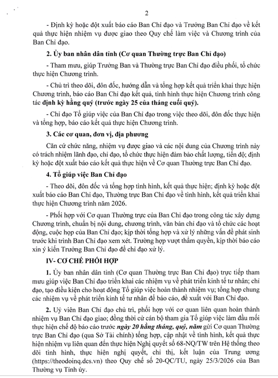 Đáng chú ý, Chương trình hành động nhấn mạnh yêu cầu tăng cường vai trò lãnh đạo, chỉ đạo của các cấp ủy, chính quyền; sự phối hợp chặt chẽ giữa các sở, ngành, địa phương trong triển khai các nhiệm vụ, giải pháp phát triển kinh tế tư nhân. Bên cạnh đó, việc đồng hành, hỗ trợ doanh nghiệp được xác định là nhiệm vụ thường xuyên, liên tục, với tinh thần “lấy doanh nghiệp làm trung tâm phục vụ”.