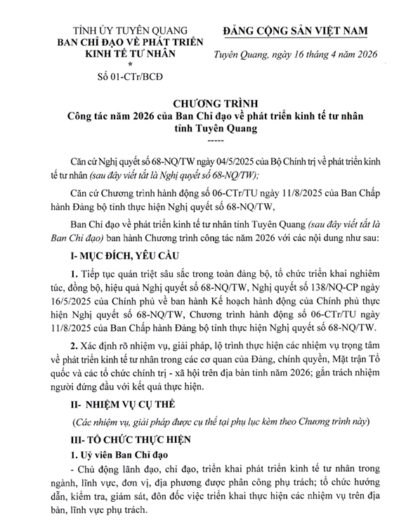 Việc ban hành Chương trình hành động số 01 không chỉ cụ thể hóa các chủ trương lớn của Đảng, Nhà nước về phát triển kinh tế tư nhân mà còn thể hiện rõ cam kết mạnh mẽ của tỉnh Tuyên Quang trong việc xây dựng môi trường đầu tư thông thoáng, minh bạch, tạo điều kiện thuận lợi để doanh nghiệp phát triển bền vững.