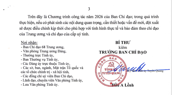 Đồng chí Hầu A Lềnh, Uỷ viên BCH Trung ương Đảng, Bí thư Tỉnh uỷ, Trưởng Ban Chỉ đạo về phát triển kinh tế tư nhân tỉnh Tuyên Quang vừa ký ban hành Chương trình công tác số 01-CTr/BCĐ, thể hiện quyết tâm mạnh mẽ và bước đi cụ thể, nhằm tạo môi trường thuận lợi, khơi thông nguồn lực và nâng cao vai trò của doanh nghiệp tư nhân trong phát triển kinh tế - xã hội của tỉnh.