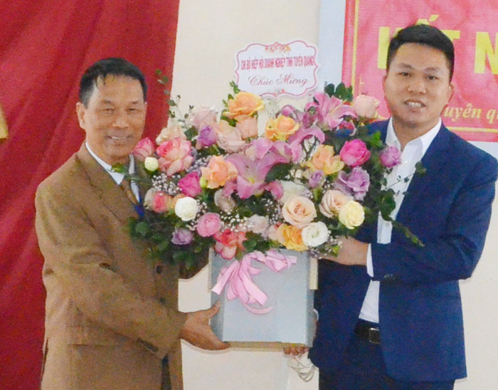 Đồng chí Nguyễn Văn Minh, Phó chủ tịch, Bí thư Chi bộ HHDN tỉnh tặng hoa chúc mừng đồng chí Nguyễn Văn Thư, Bí thư chi bộ, Tổng GĐ Công ty CP Tổng Công ty May Tuyên Quang LGG có thêm 10 đảng viên mới.