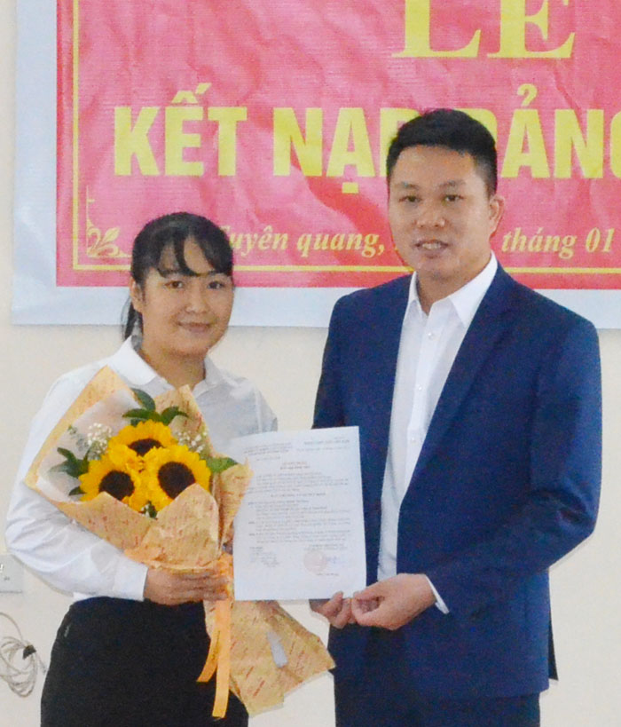 Đồng chí Nguyễn Văn Thư, Bí thư chi bộ, Tổng GĐ công ty trao Quyết định kết nạp đảng viên của Ban Thường vụ Đảng ủy Khối các Cơ quan &Doanh nghiệp tỉnh cho quần chúng ưu tú QUÁCH THỊ DUNG, nhân viên Phòng Kỹ thuật.