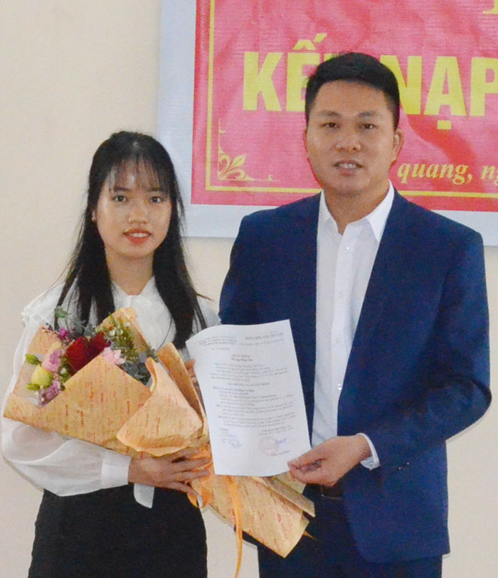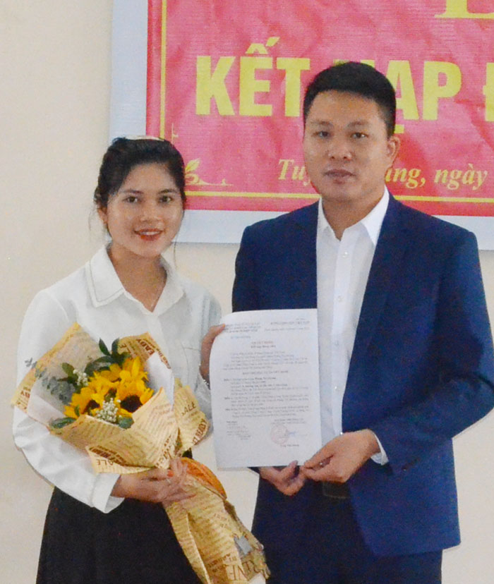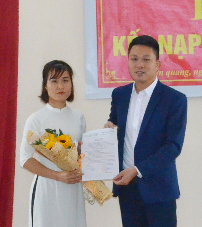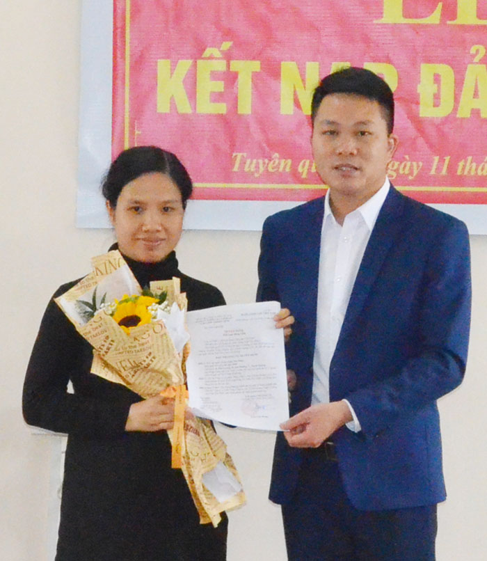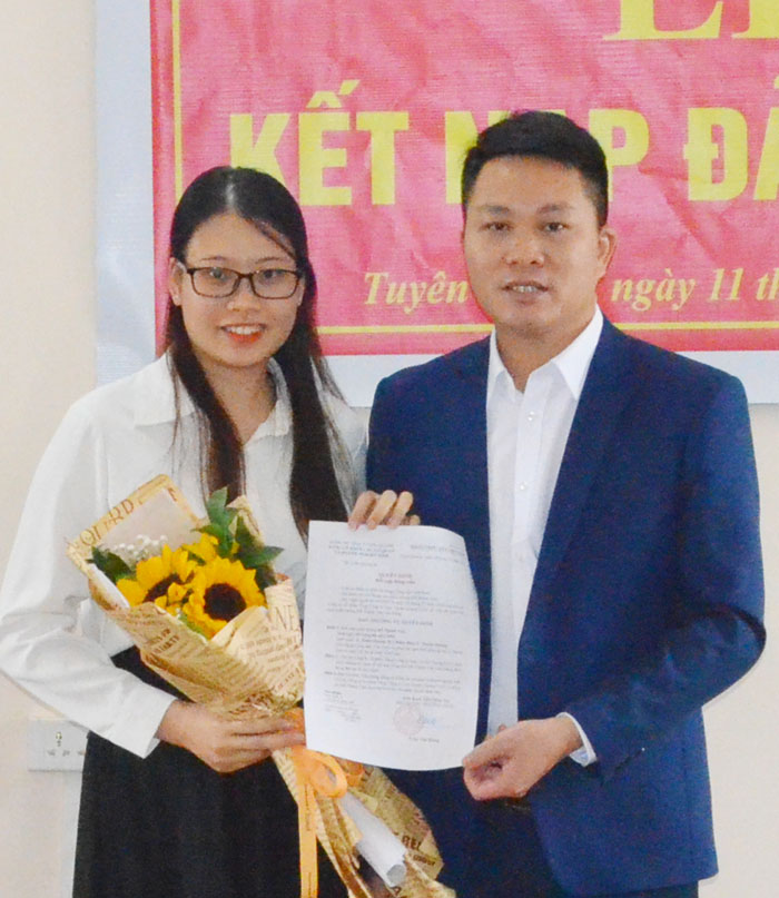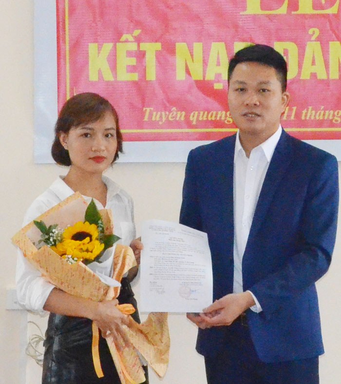 Đồng chí Nguyễn Văn Thư, Bí thư chi bộ, Tổng GĐ công ty trao Quyết định kết nạp đảng viên của Ban Thường vụ Đảng ủy Khối các Cơ quan &Doanh nghiệp tỉnh cho quần chúng ưu tú TRẦN THU THẢO, Phó phòng Kế hoạch - thị trường.
