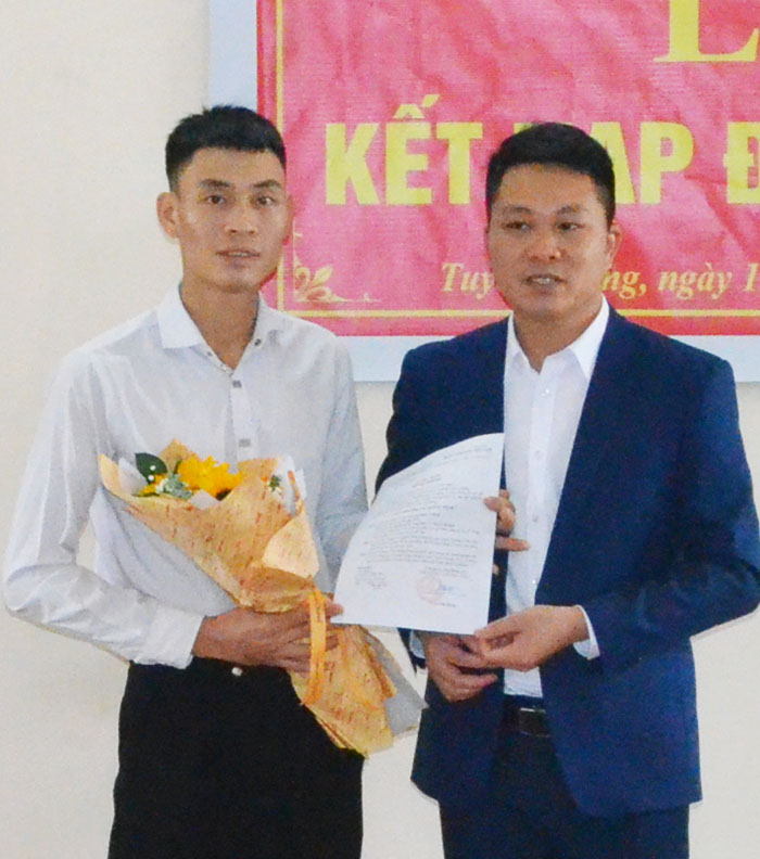 Đồng chí Nguyễn Văn Thư, Bí thư chi bộ, Tổng GĐ công ty trao Quyết định kết nạp đảng viên của Ban Thường vụ Đảng ủy Khối các Cơ quan &Doanh nghiệp tỉnh cho quần chúng ưu tú VŨ NGỌC HOÀNG – Nhân viên Phòng Kỹ thuật.