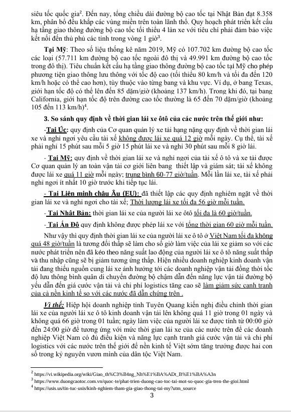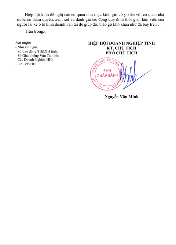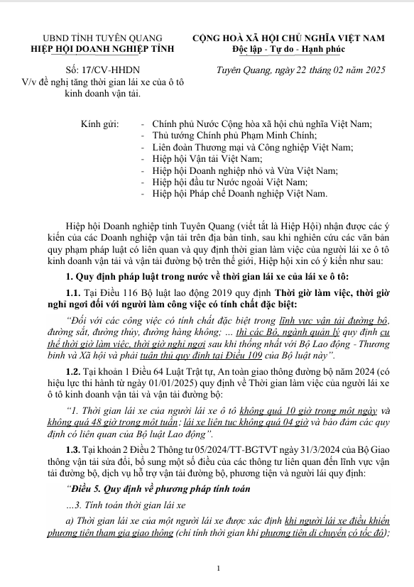 Tiếp thu ý kiến từ cộng đồng doanh nghiệp vận tải trên địa bàn tỉnh, từ kết quả khảo sát thực tế, nghiên cứu các văn bản quy phạm pháp luật hiện hành và so sánh với quy định của nhiều quốc gia trên thế giới; từ ngày 22/02/2025, ông Nguyễn Hữu Thập, Ủy viên BCH Liên đoàn Thương mại và Công nghiệp Việt Nam (VCCI), Phó Chủ tịch Hiệp hội Pháp chế Doanh nghiệp Việt Nam, Chủ tịch Hiệp hội Doanh nghiệp tỉnh Tuyên Quang đã chỉ đạo Hiệp hội ban hành Văn bản số 17/CV-HHDN gửi Chính phủ, Thủ tướng Chính phủ, Liên đoàn Thương mại và Công nghiệp Việt Nam, Hiệp hội Vận tải Việt Nam, Hiệp hội Doanh nghiệp nhỏ và vừa Việt Nam, Hiệp hội Đầu tư nước ngoài Việt Nam và Hiệp hội Pháp chế Doanh nghiệp Việt Nam về việc đề nghị điều chỉnh tăng thời gian lái xe của ô tô kinh doanh vận tải cho phù hợp với thực tiễn sản xuất, kinh doanh và nhu cầu vận chuyển hiện nay.
